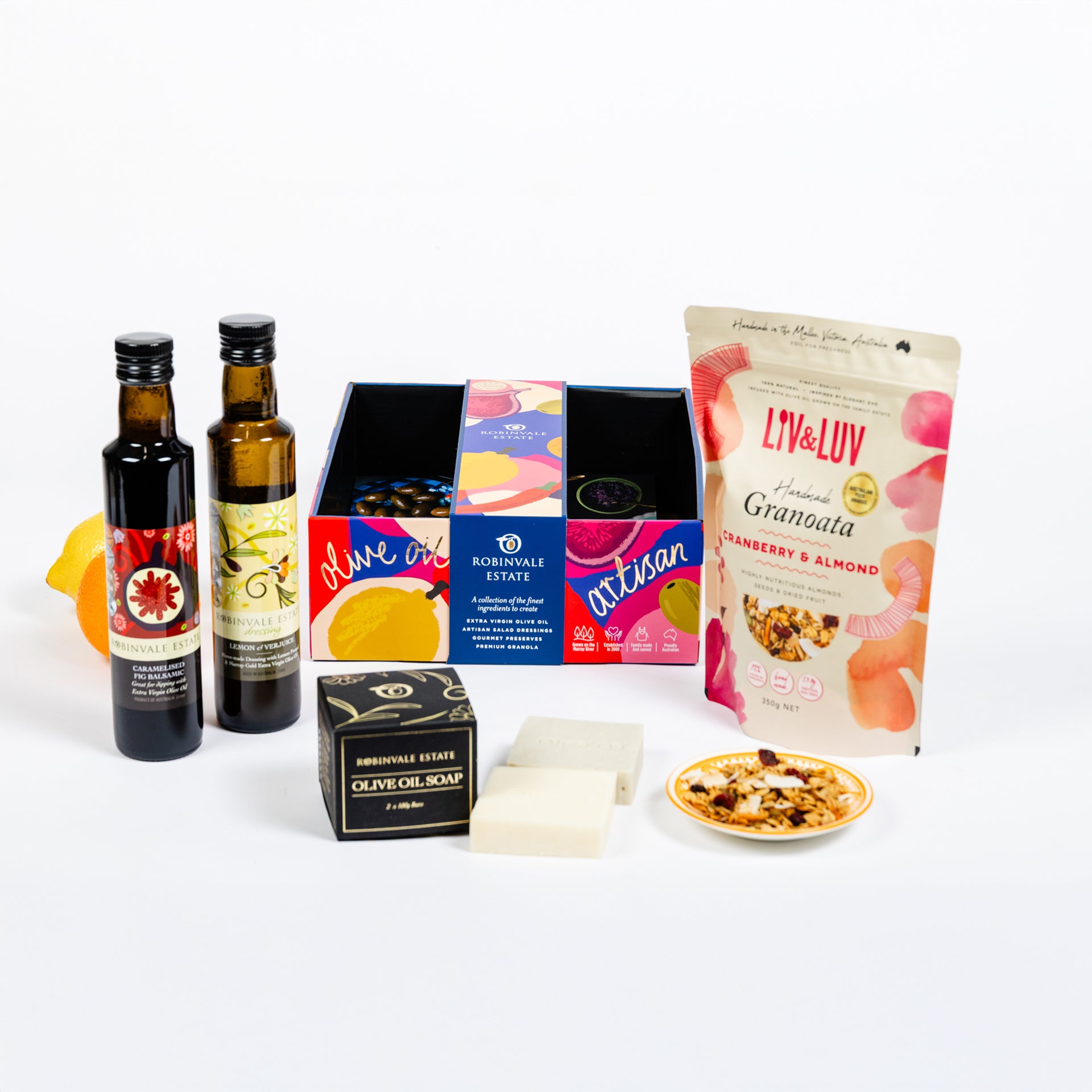 Robinvale Estate Caramelised Fig Balsamic 250ml, Robinvale Estate Lemon & Verjuice Olive Oil Dressing 250ml, Cranberry & Almond Granoata 350gr & Olive Oil Soap x 2 Bars 110gr each.